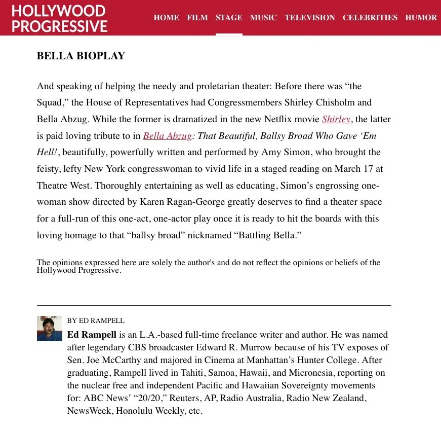 I'm very happy to share this terrific review of the staged reading of Amy Jan Simon's play about BELLA ABZUG, presented at the esteemed Theatre West in Los Angeles. I am so proud to have directed Amy in this very special play!